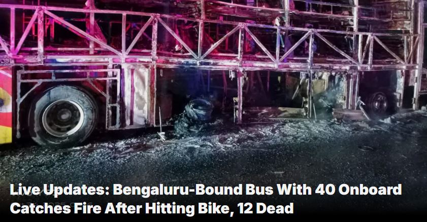 Bengaluru-Bound Bus fire accident: आंध्र प्रदेश के कुर्नूल में शुक्रवार तड़के एक दर्दनाक हादसे में कम से कम 20 लोगों की मौत हो गई। यह हादसा उस समय हुआ जब बेंगलुरु जा रही एक प्राइवेट बस सड़क हादसे के बाद आग की लपटों में घिर गई और पूरी तरह जलकर राख हो गई। बस में करीब 40 यात्री और दो चालक सवार थे।
